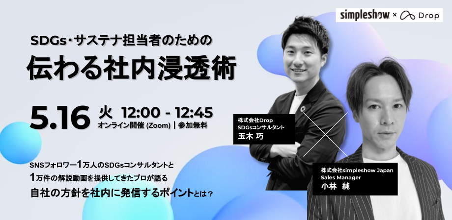 この度、株式会社simpleshow Japanでは、SDGsに取り組んでいく企業の理解と実践をサポートするコンサルティング会社の株式会社Dropと共催で、無料ウェビナーを開催することになりました。