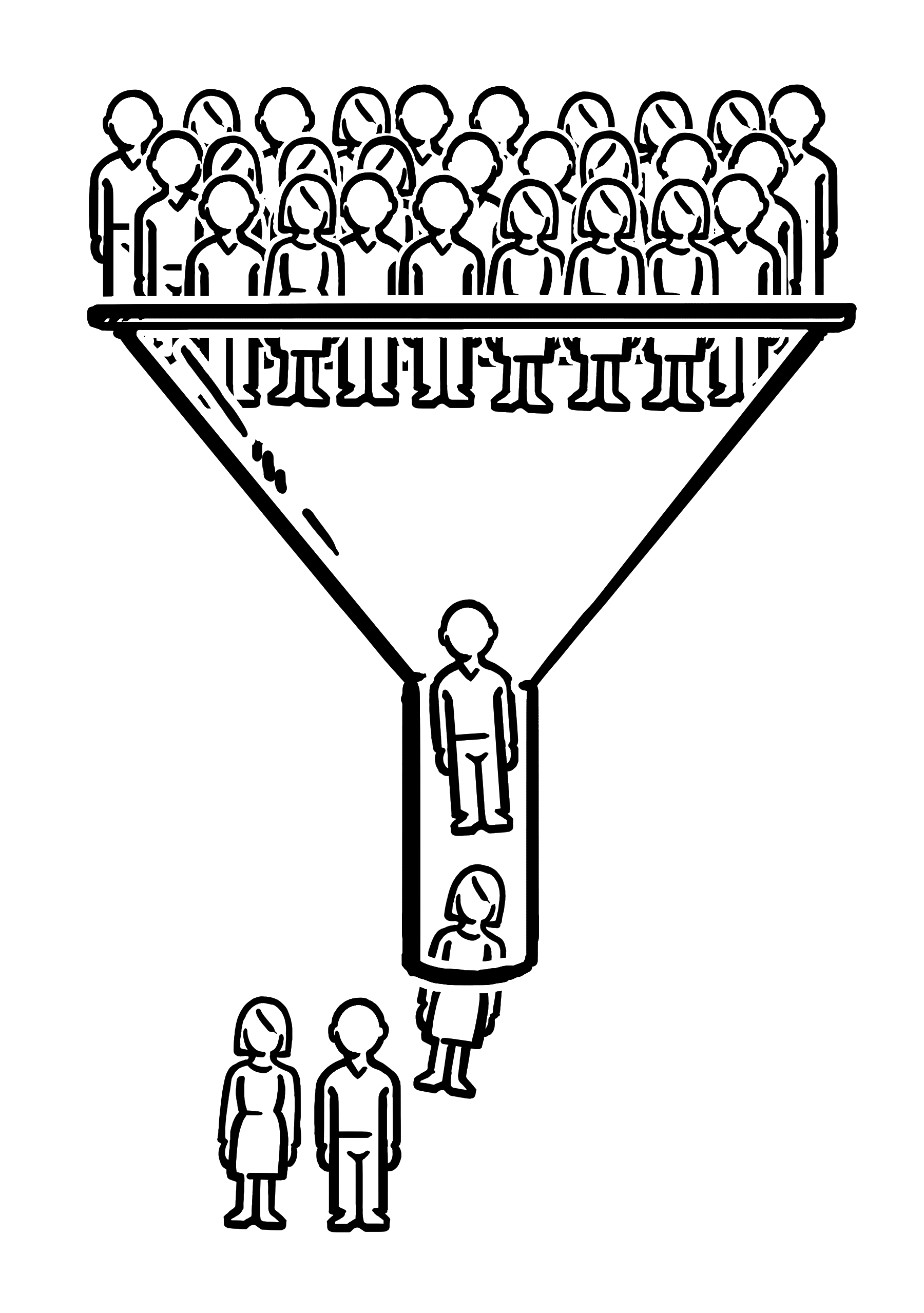セールスファネルとは、潜在顧客が見込み客となって顧客になるまで、すなわち購入までのプロセスを視覚的に表現したもの。広く集客した上で、ふるいにかけられた顧客がだんだんと少なくなっていくため、漏斗(ろうと=ファネル)に例えて「セールスファネル」と呼ばれます。